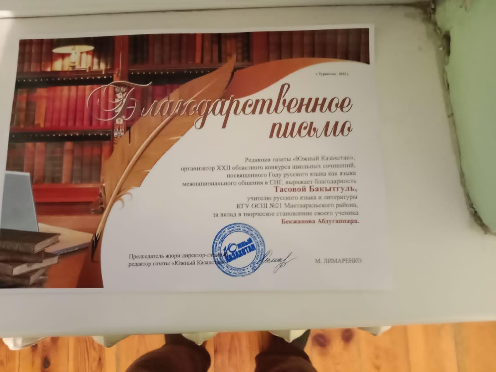 Түркістан облысы, Мақтаарал ауданы білім бөліміне қарасты " N21 Нұрлы жол жалпы білім беретін мектебімізде орыс тілі және әдебиеті пәнінен Бекжанов Абдіғаппар 7-сынып "Могучший красивый русский язык" облыстық конкурска қатысып нәтижесінде оқушысы Бекжанов Абдіғаппар грамота алды жетекшісі Тасова Бактыгуль Бурибаевна "Алғыс хатпен марапатталды.Жаңашыл ұстазға "Русский язык - мой второй язык" мақаласы жарияланды.Оқушымыз Бекжанов Абдіғаппардың мақаласы Алғыс хатпен марапатталды.